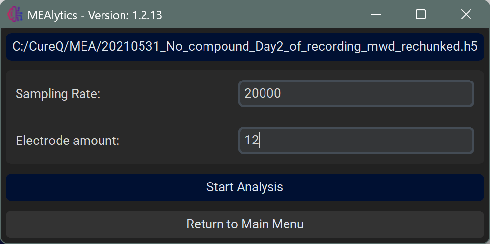 First, press Select a file and select the file you want to process. Next, insert the sampling rate of the experiment, and the amount of electrode that each well contains. Then, press Start Analysis.