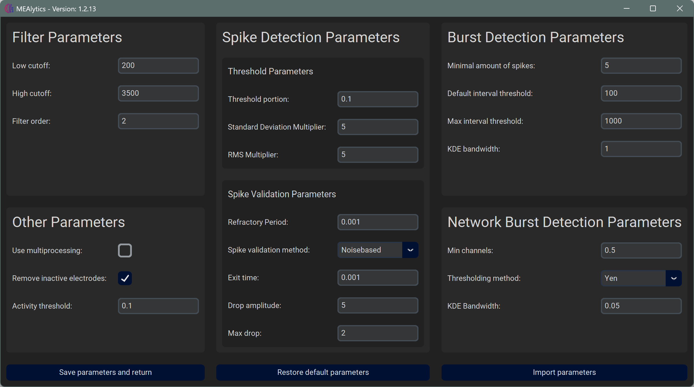 Parameters from previous experiments can be loaded using Import parameters. Every experiment will generate a file called parameters.json in the output folder. These files can be selected to copy the parameters to the current analysis.