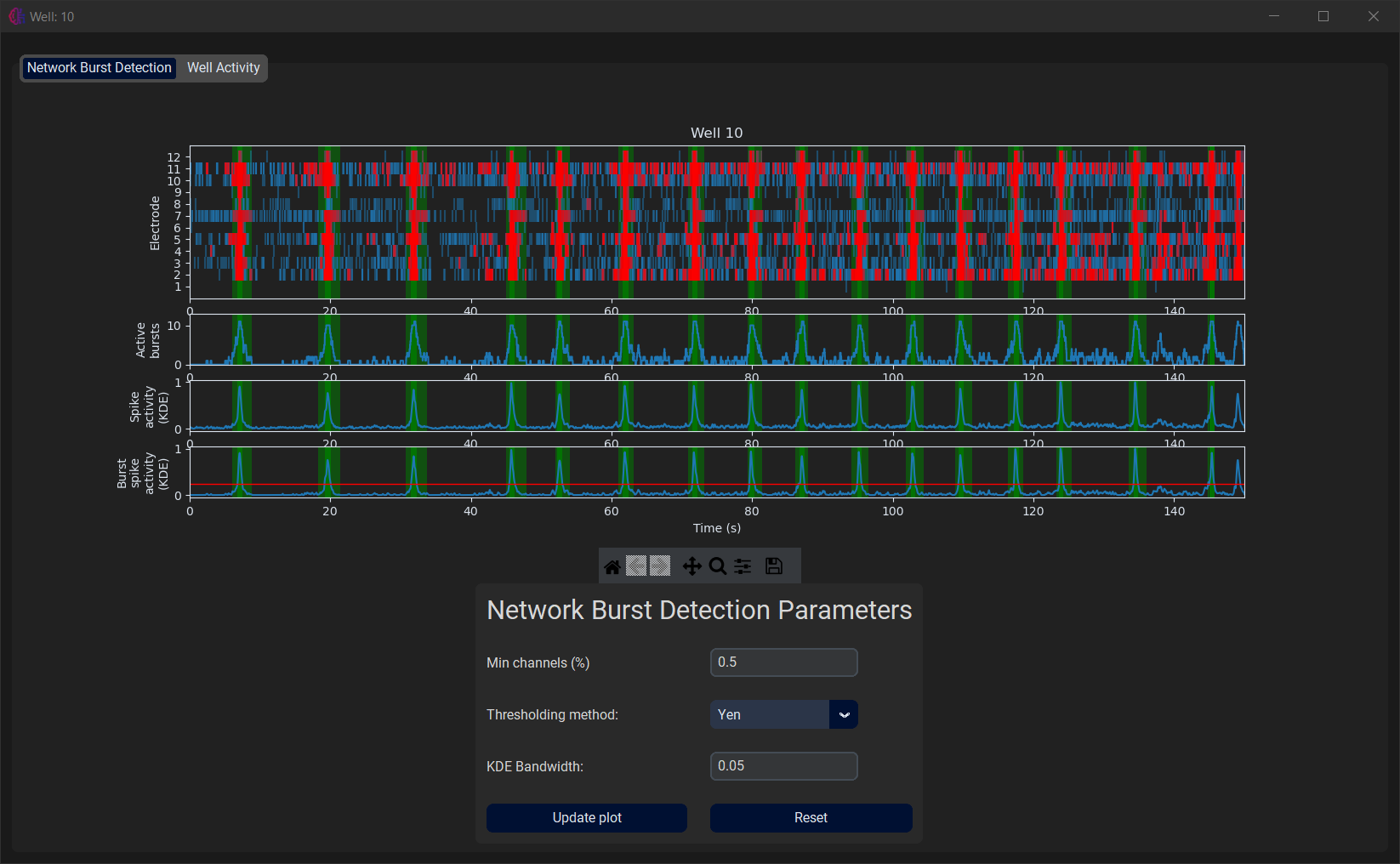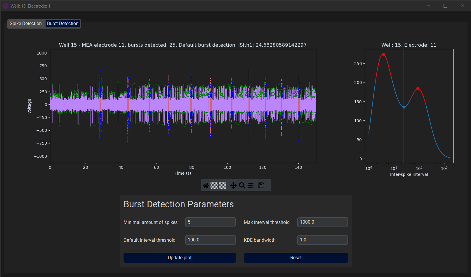 In the second tab, the burst detection is applied to the electrode data is shown, as well as the kernel density estimate that was used to determine the burst detection parameters. Again, the user can change certain parameters to see how they could affect the burst detection process without influencing the outcome of the current experiment.