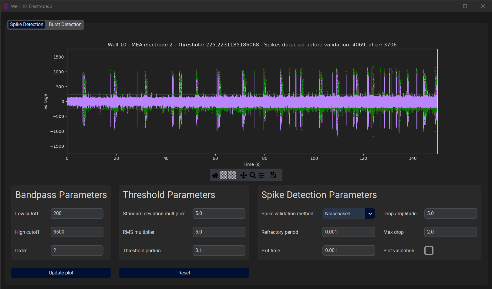 Again, this window contains two tabs, Spike Detection and Burst Detection. The first tab displays the spike detection applied to the raw electrode data. It also contains all the parameters that influence the spike detection. The user can alter these parameters to see how they could affect the analysis. They will not have any effect on the outcomes of the current experiment, or further steps, such as burst or network burst detection.